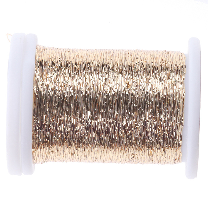 Flat metallic Mylar reinforced with a special double polyamide mono filament. Highly recommended for ribbings on small and extremely small artificials, or combined with other fibers to give a dash of brilliance.